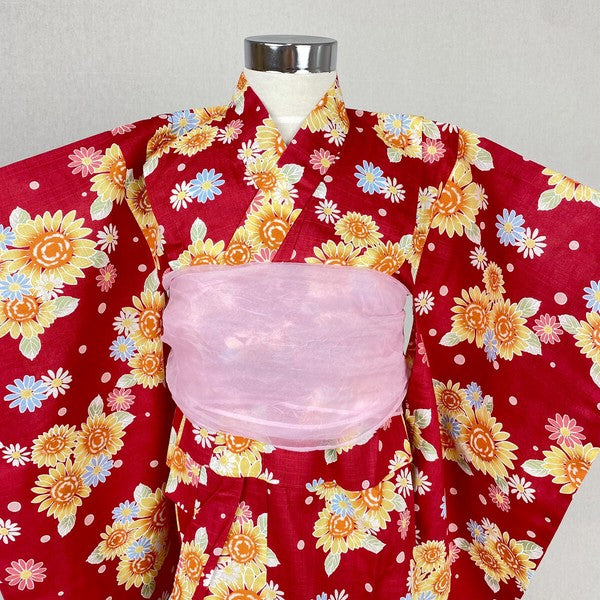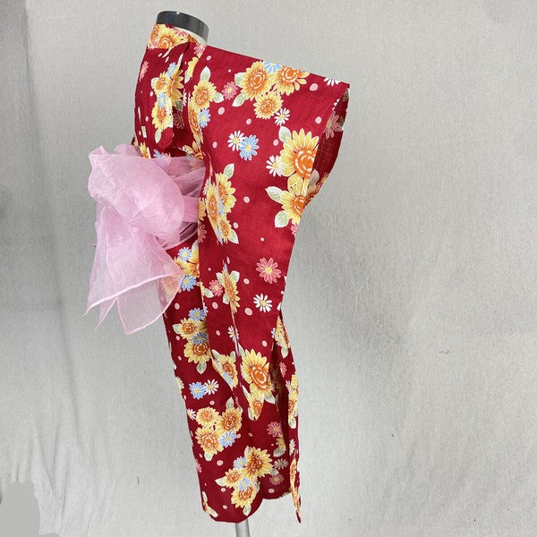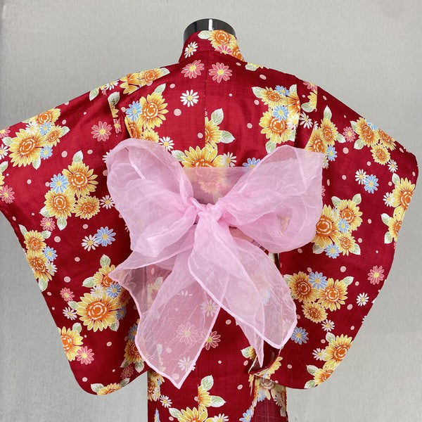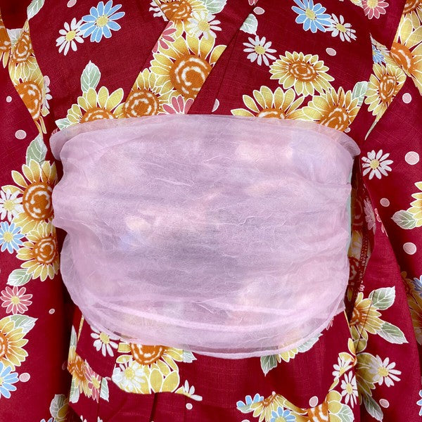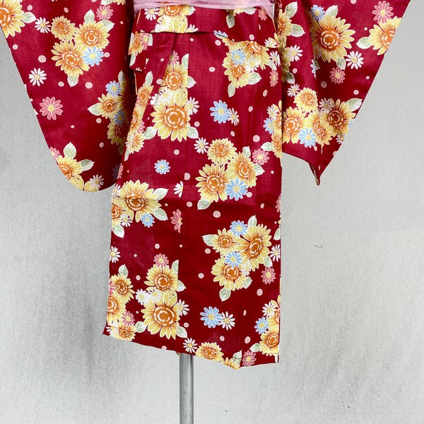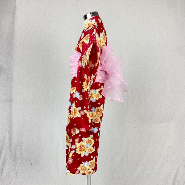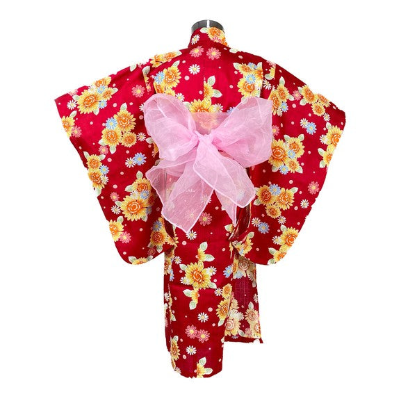 2-pc Kids’ Yukata Set | Sunflowers on Red w/ Pink Obi Design (2 sizes)