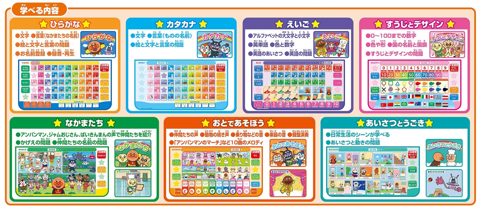 Comes with a hiragana sheet, plus additional sheets for katakana, friends, greetings, and movements – 3 sheets with a total of 6 play surfaces.