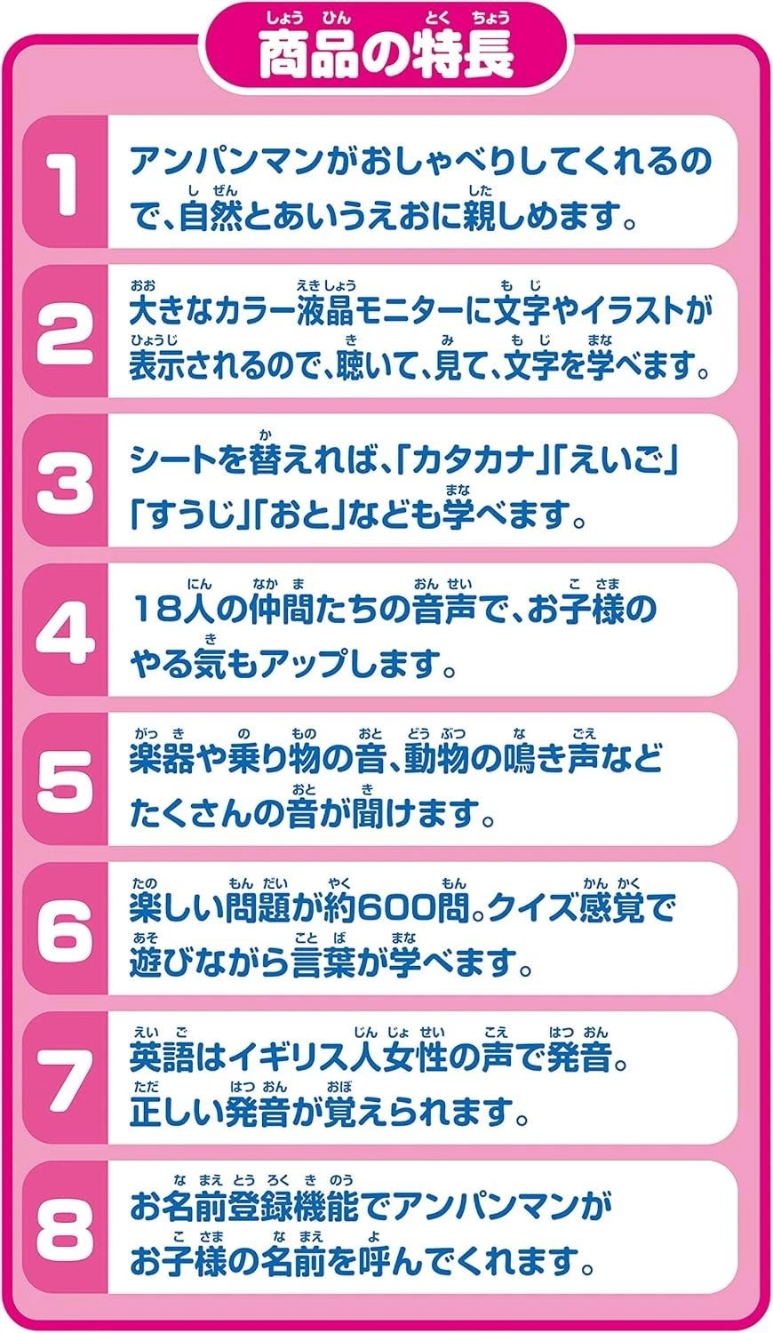 A fun and educational Hiragana tablet that lets children watch the large colour LCD monitor and learn by touching the play board.