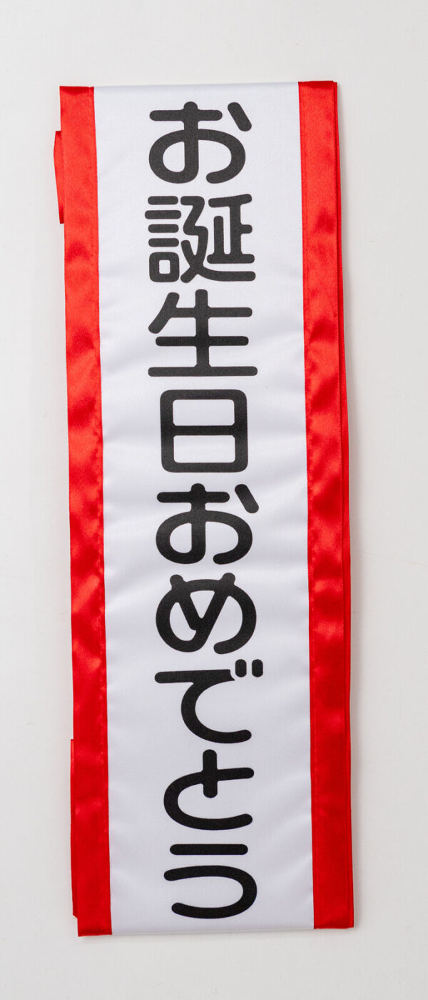 - Festive birthday sash featuring the Japanese phrase 「お誕生日おめでとう」 meaning "Happy Birthday"