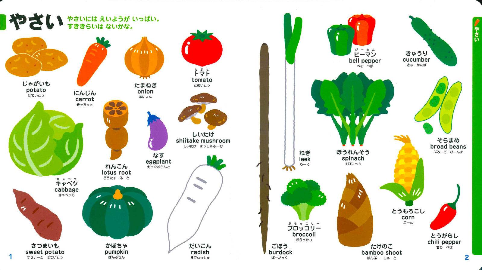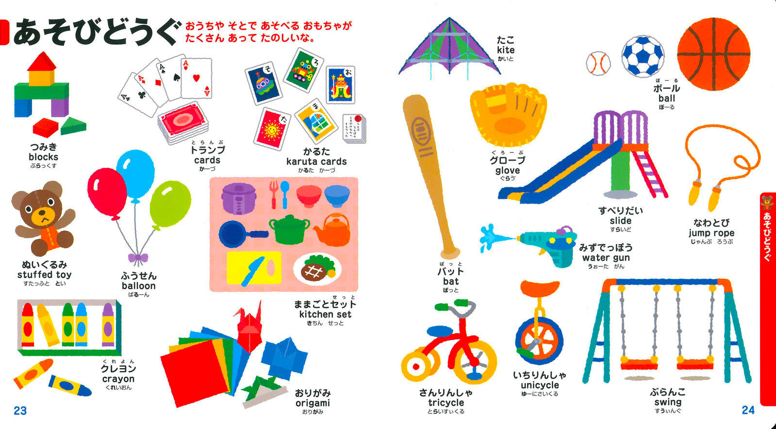 Objects such as “vegetables,” “vehicles,” and “everyday items” are introduced through cute and colourful illustrations. While having fun, children can quickly learn around 300 objects and words together with their English equivalents. The items are grouped by theme, helping children develop an understanding of categorisation and relationships between things. It’s a fun and engaging way for parents and children to communicate while expanding their knowledge together.