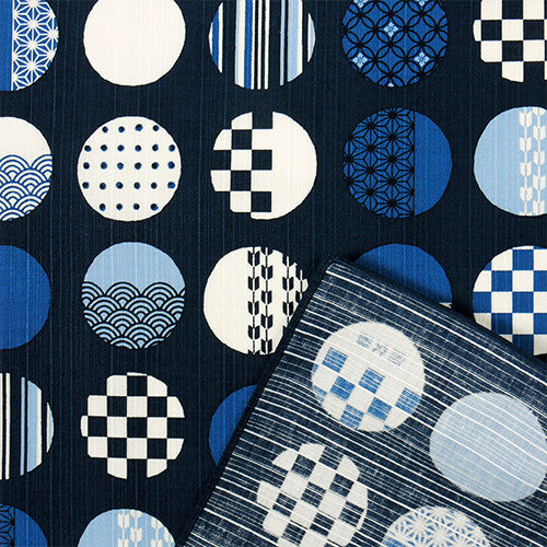 ✔️ Classic Japanese design – A sophisticated arrangement of varied circular patterns, including seigaiha (wave), shippou (seven treasures), and ichimatsu (checkered), in navy and white hues.