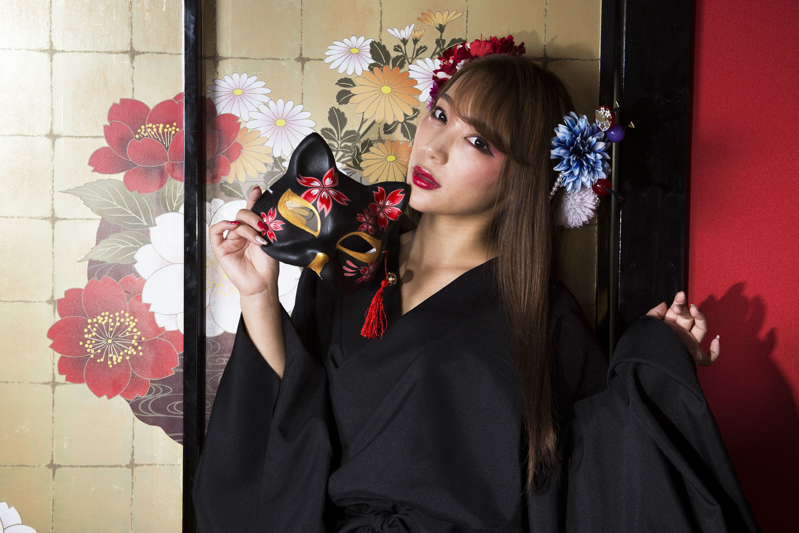 Half-face fox mask with striking gold accents on a black base. Hand-painted cherry blossom details add a charming touch, while the tassels with bells on the sides bring a festive flair. The mask is made of sturdy, hardened paper for a solid feel.