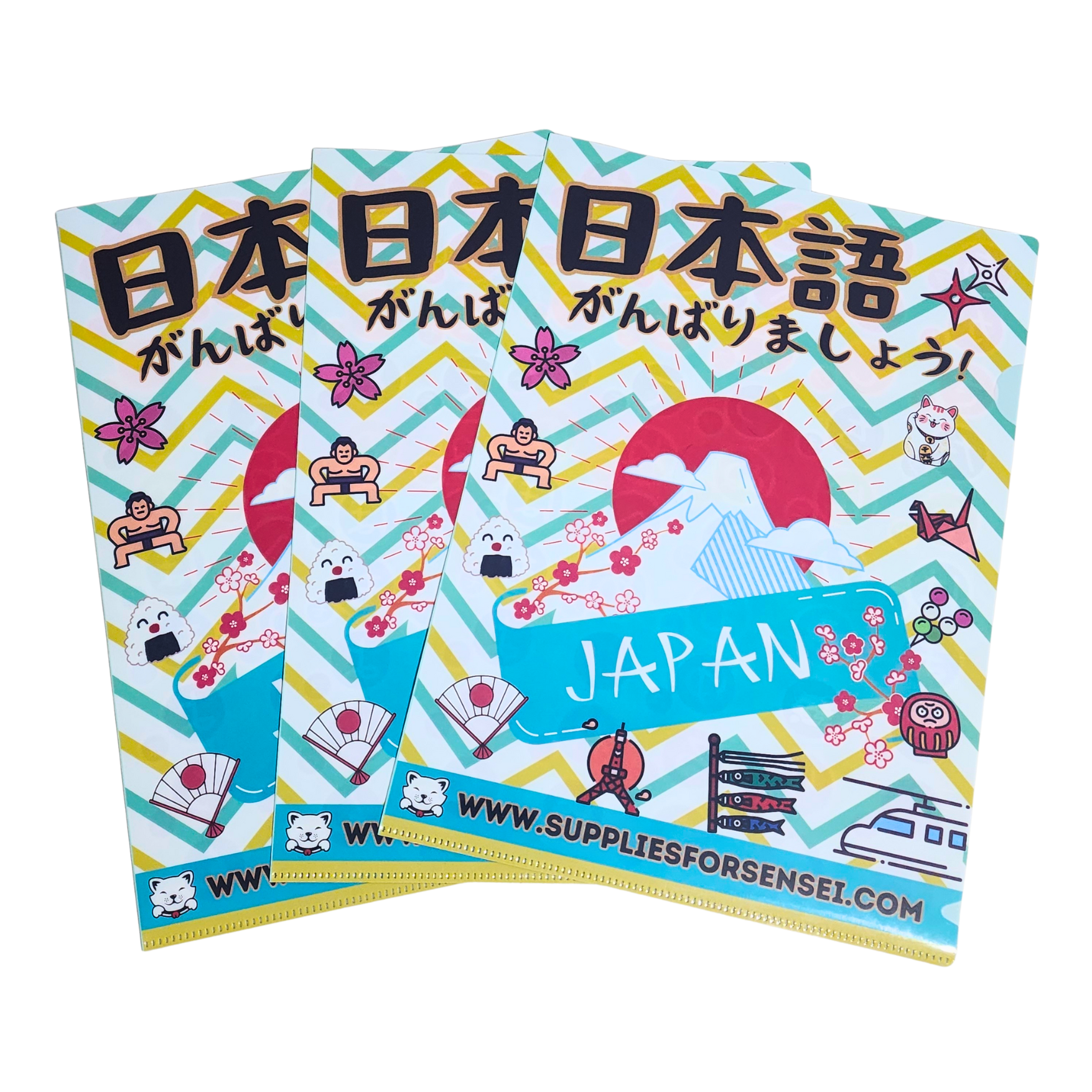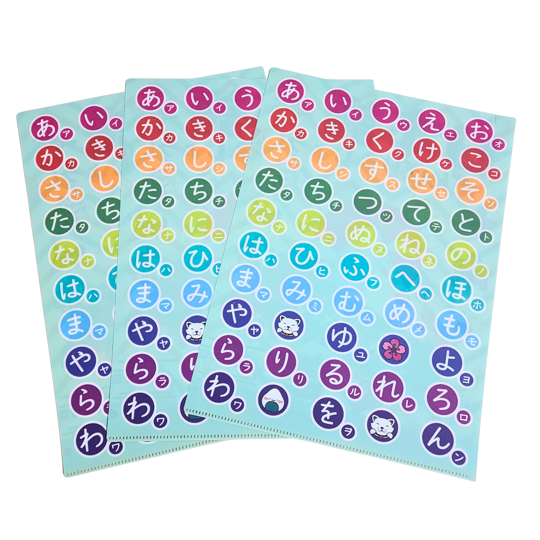 Add a pop of colour and culture to your classroom! These sturdy, wipe-clean A4 folders feature a fun Japanese motif on the front and a full hiragana/katakana chart on the back — both eye-catching and educational.