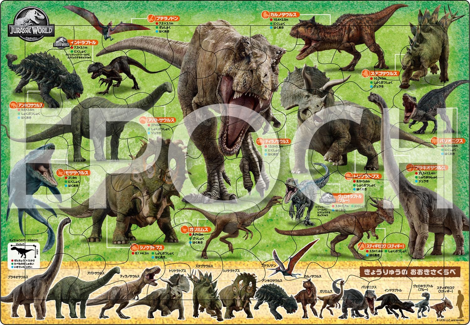Discover the world of dinosaurs in this action-packed 63-piece puzzle, featuring iconic Jurassic World creatures like Tyrannosaurus, Stegosaurus, Triceratops, and Indoraptor. Each dinosaur includes Japanese labels with fun facts such as size, diet, and time period, making it both educational and exciting!