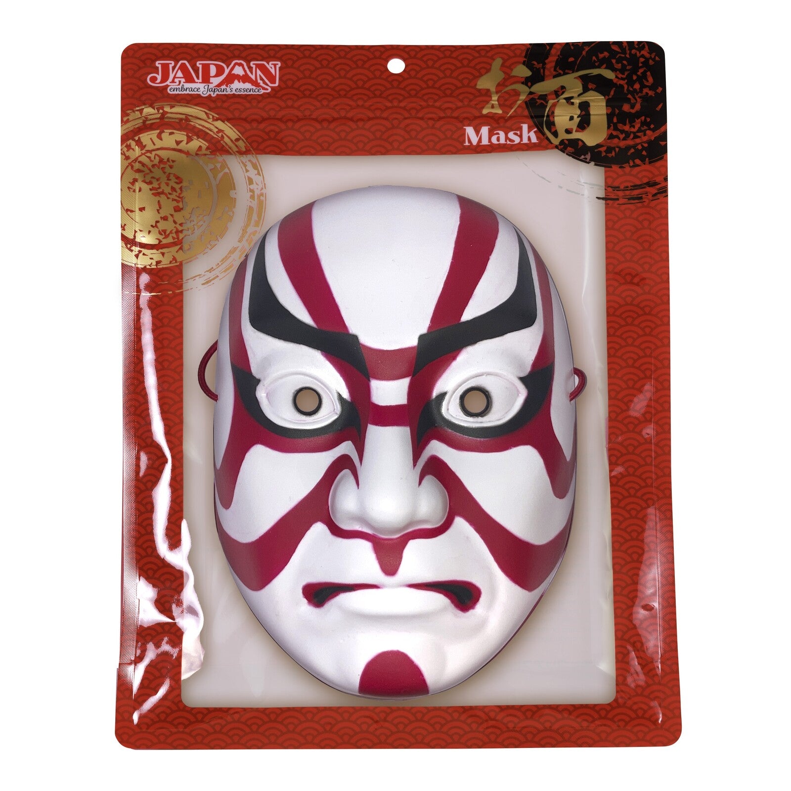 A traditional Japanese-inspired mask featuring a bold wa design. This striking mask is modelled after the dramatic kumadori makeup of Kabuki theatre. The “Sujiguma” style, painted with powerful red and black lines on a white base, is one of the most iconic kumadori patterns, often used to represent brave warriors and strong heroes.