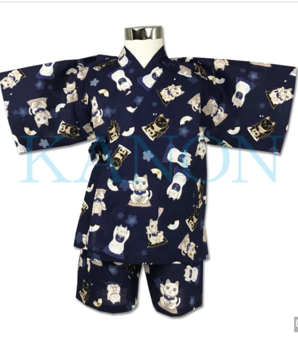 Let your child embrace Japanese tradition and comfort with this adorable Manekineko Navy Kid’s Jinbei! Featuring a charming lucky cat (Manekineko) pattern on a deep navy-blue background, this jinbei is perfect for summer festivals, bedtime, or casual indoor wear.