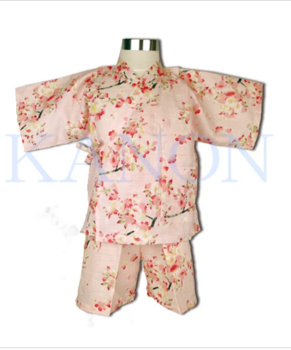Let your little one enjoy summer in traditional Japanese style with this Kid’s Jinbei featuring a delicate sakura (cherry blossom) print on a soft pastel pink background. Made from breathable cotton, this lightweight and comfortable jinbei set is perfect for warm weather, festivals, lounging at home, or even bedtime.