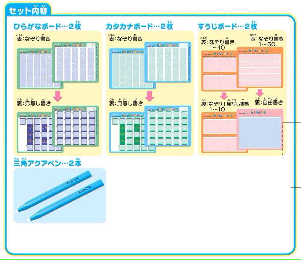 ■Set contents: Hiragana board: 2 sheets, Katakana board: 2 sheets, Number board: 2 sheets, Triangular Aqua Pen: 2