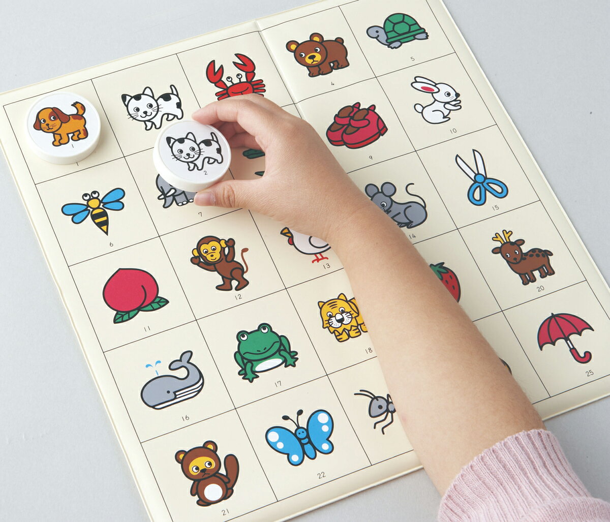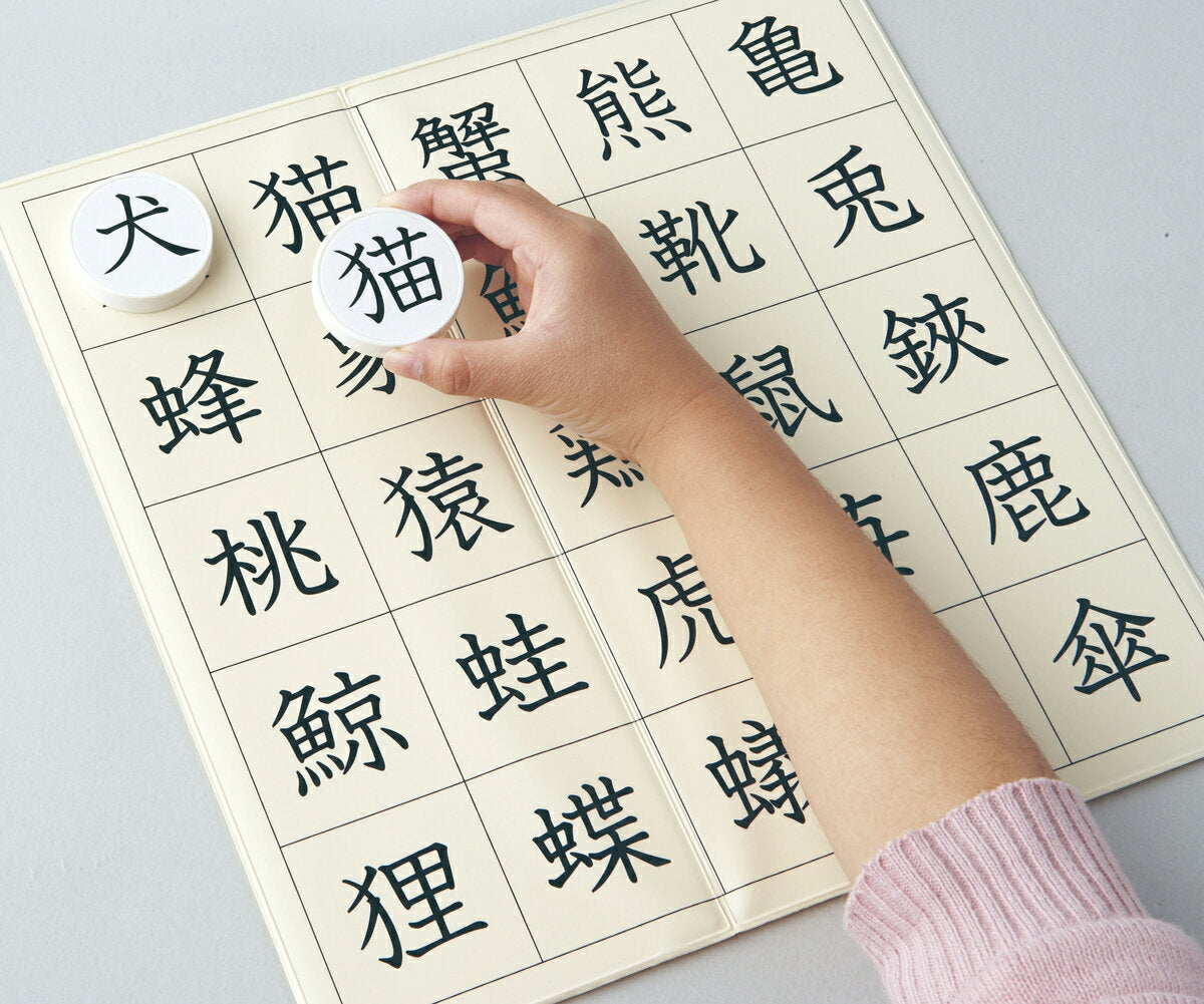The front side of the pieces features an illustration of a familiar animal or food, and the back side features the kanji for that illustration, which is easy to remember in shape. Play by placing a piece with the same illustration on top of the illustration on the board, or flipping it over and placing a piece with the kanji for that illustration.