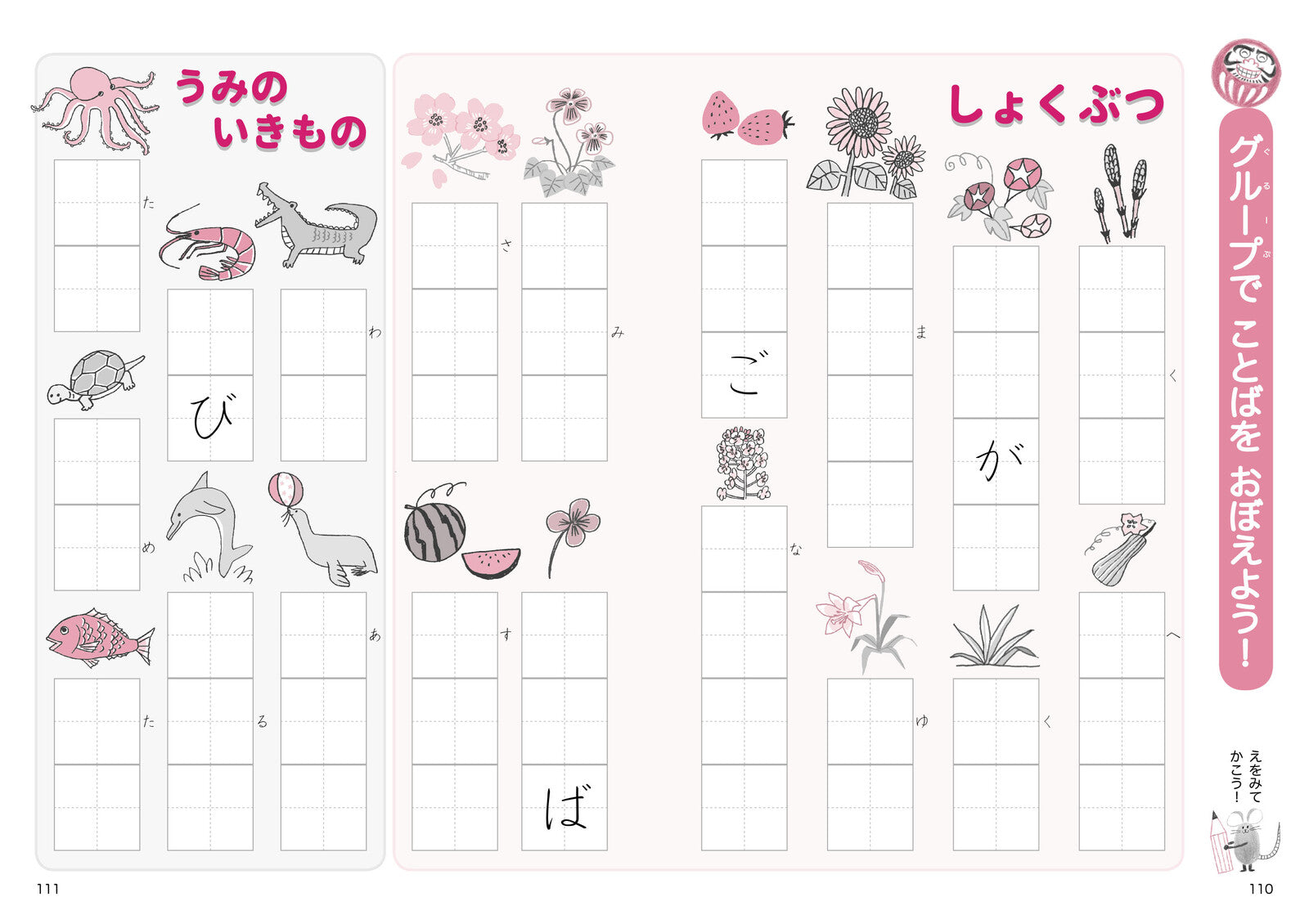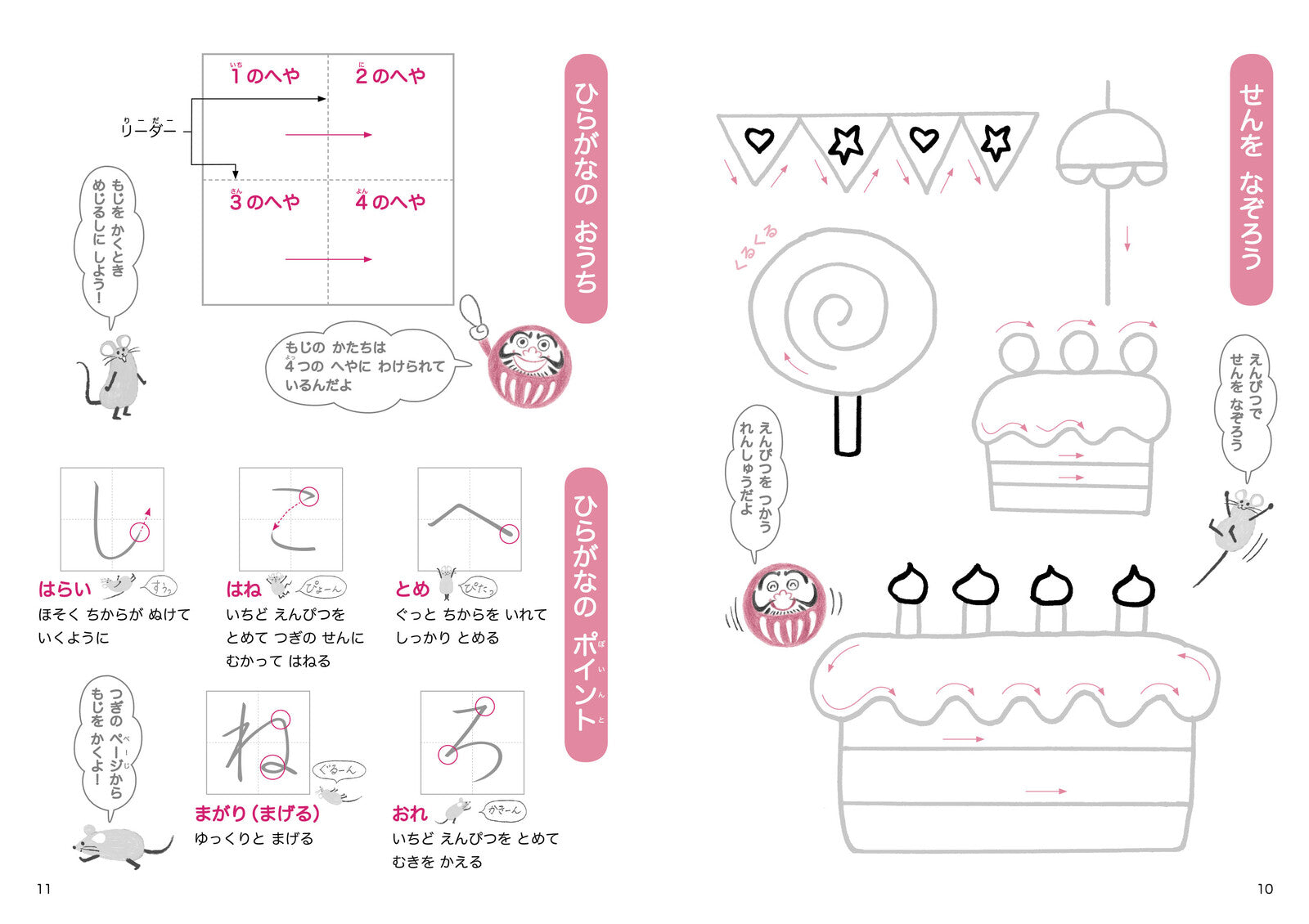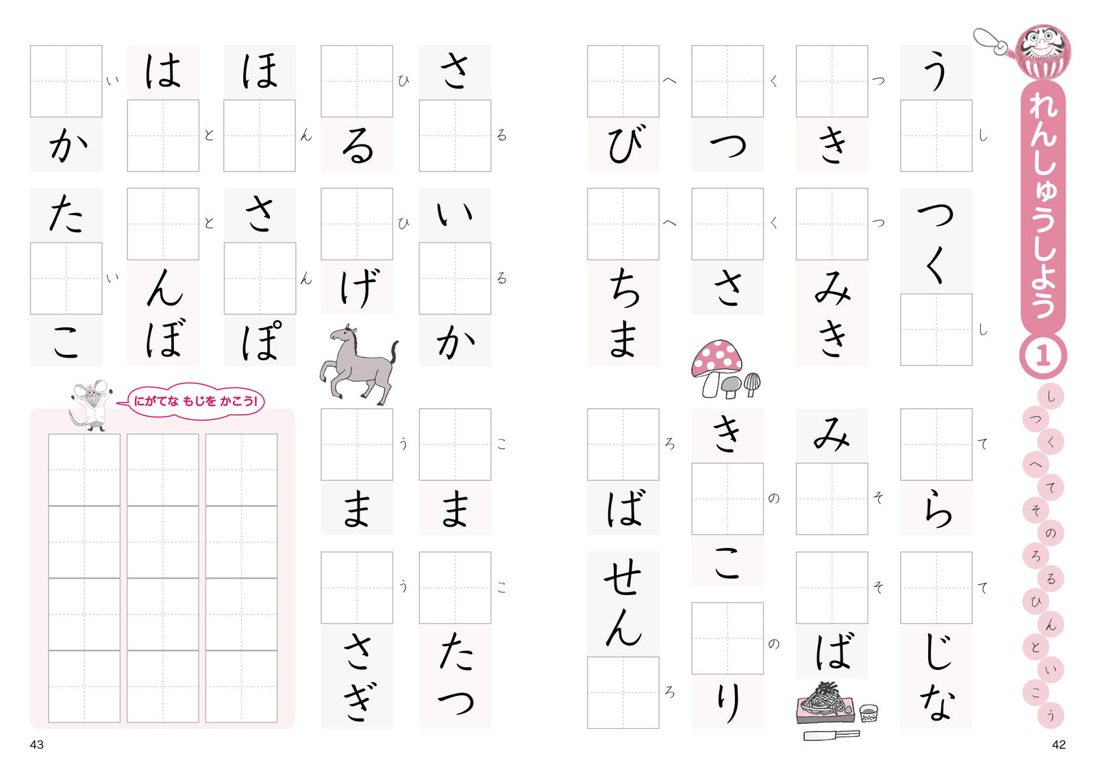 This popular hiragana practice book features the beloved characters Mouse and Daruma as your guides!