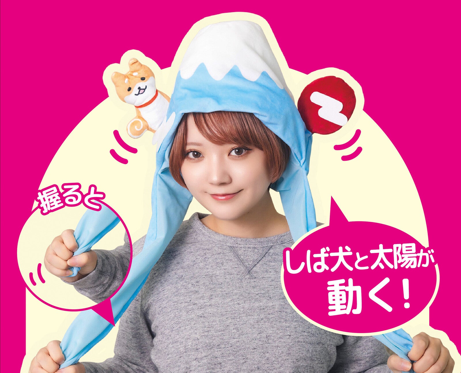 Stand out from the crowd with this fun and eye-catching Mt. Fuji Shibainu & Sunrise Pop-up Head Costume. A year-round favourite for costumes and parties, this quirky hat features a hand pump on the handle — press it and watch a Shiba Inu pop out from one side and a rising sun from the other.