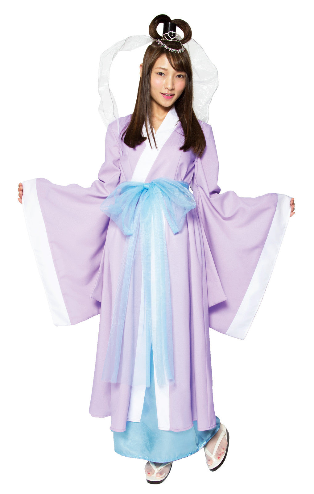 The kimono-style one-piece dress fastens with a centre-back zipper for easy dressing, while the inner skirt comes with an elastic waistband for comfort. Finished in soft pastel colours, the entire outfit creates a gentle, fairy-like impression.