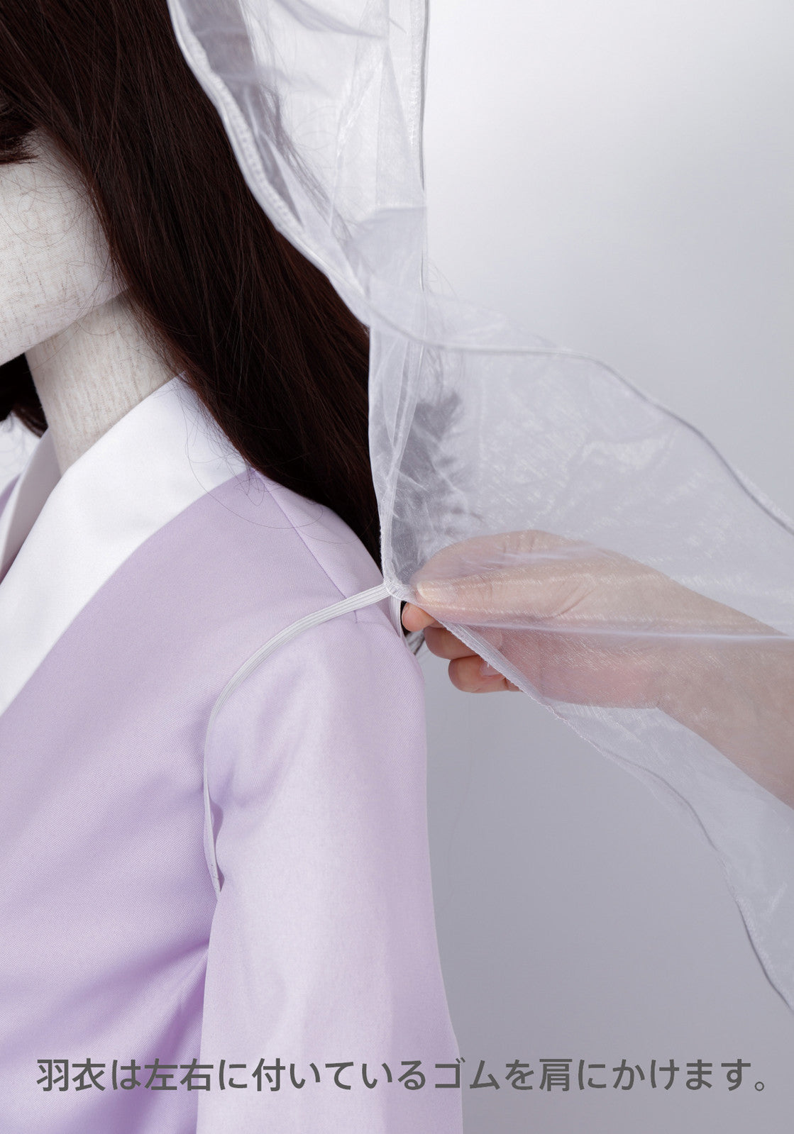 Step into the world of Japanese folklore with this graceful Otohime-inspired costume. The highlight is the elegant hagoromo veil, designed for both beauty and ease of wear. Simply drape the veil over your shoulders with the elastic bands facing forward, then secure it at the top of your head using the included pin and central loop for a stable fit. The veil features a flexible wire edge, allowing you to shape it perfectly.