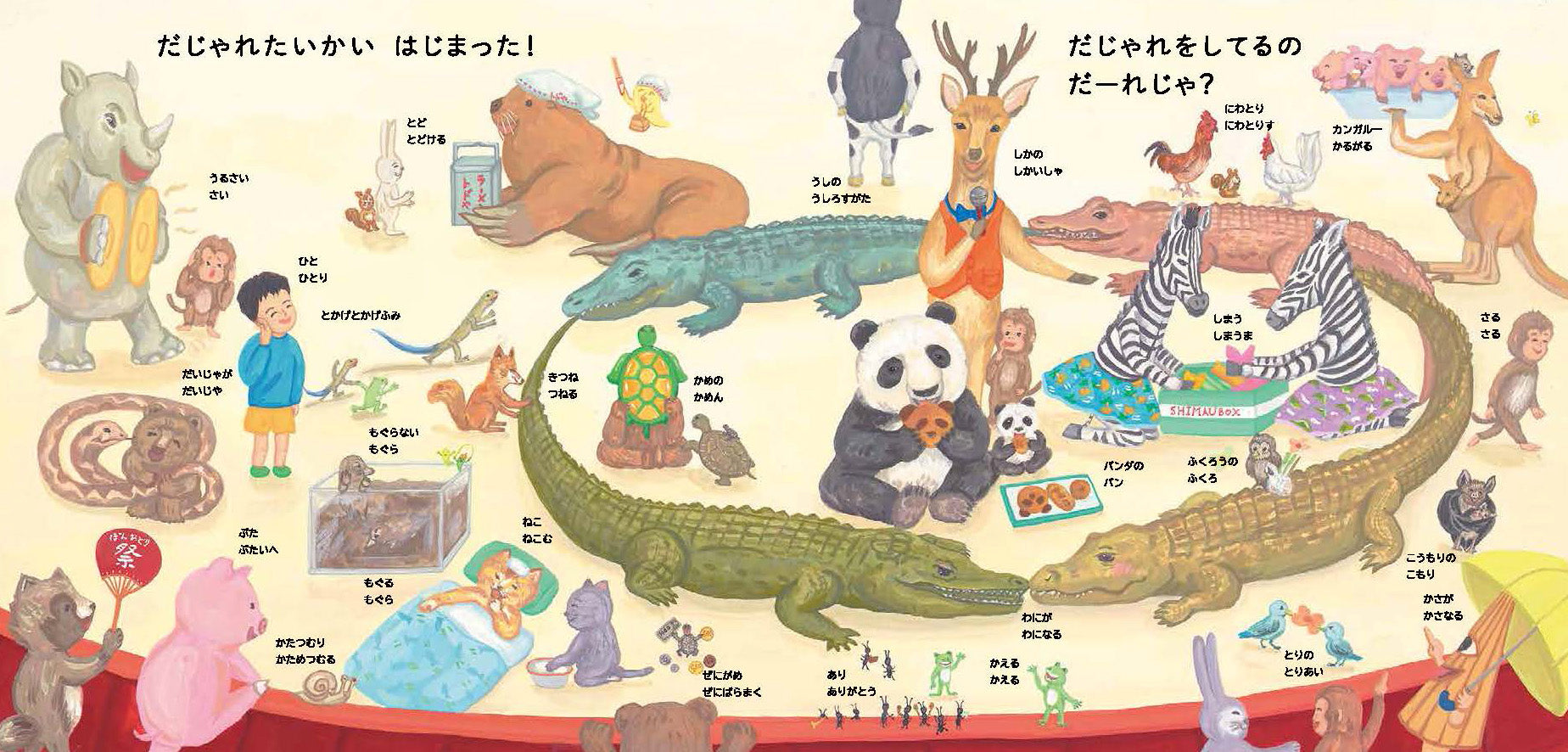 With silly animal puns like “Ushi no ushiro de ushishishi” (Laughing behind the cow), “Kaba no kaban ni kaba no kao” (A hippo face on a hippo’s bag), and “Arienai yo~! Ari iru yo!” (No way—there's an ant!), a parade of animals heads toward the grand circus performance by the Zebra Sisters!